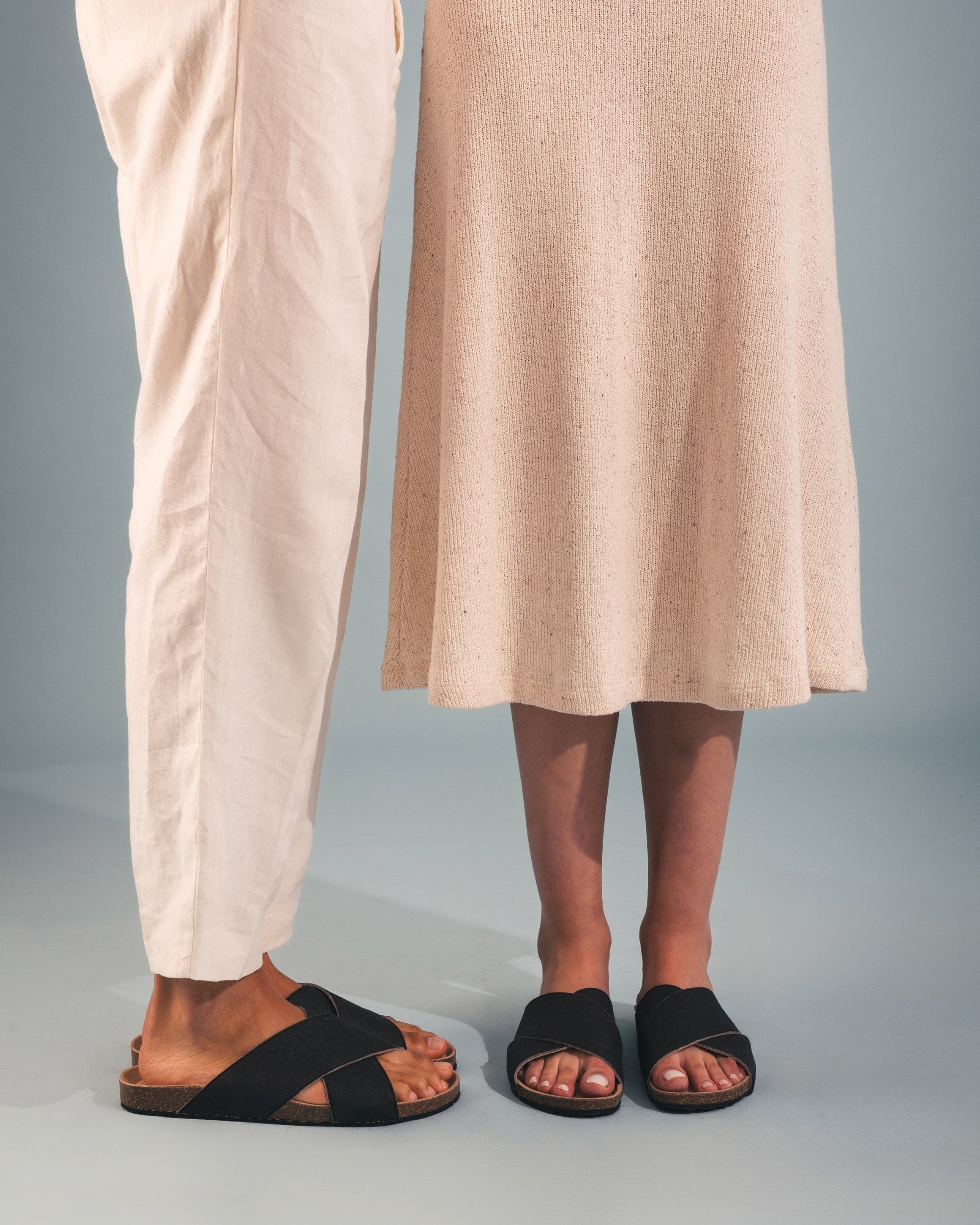 Portez les Tupai avec un jean coupe droite, une combinaison légère ou une robe ample pour un look estival affirmé. Cette sandale vegan pinatex audacieuse transforme une tenue simple en statement responsable. Les larges lanières en Pinatex captent la lumière et attirent naturellement le regard vers vos pieds.