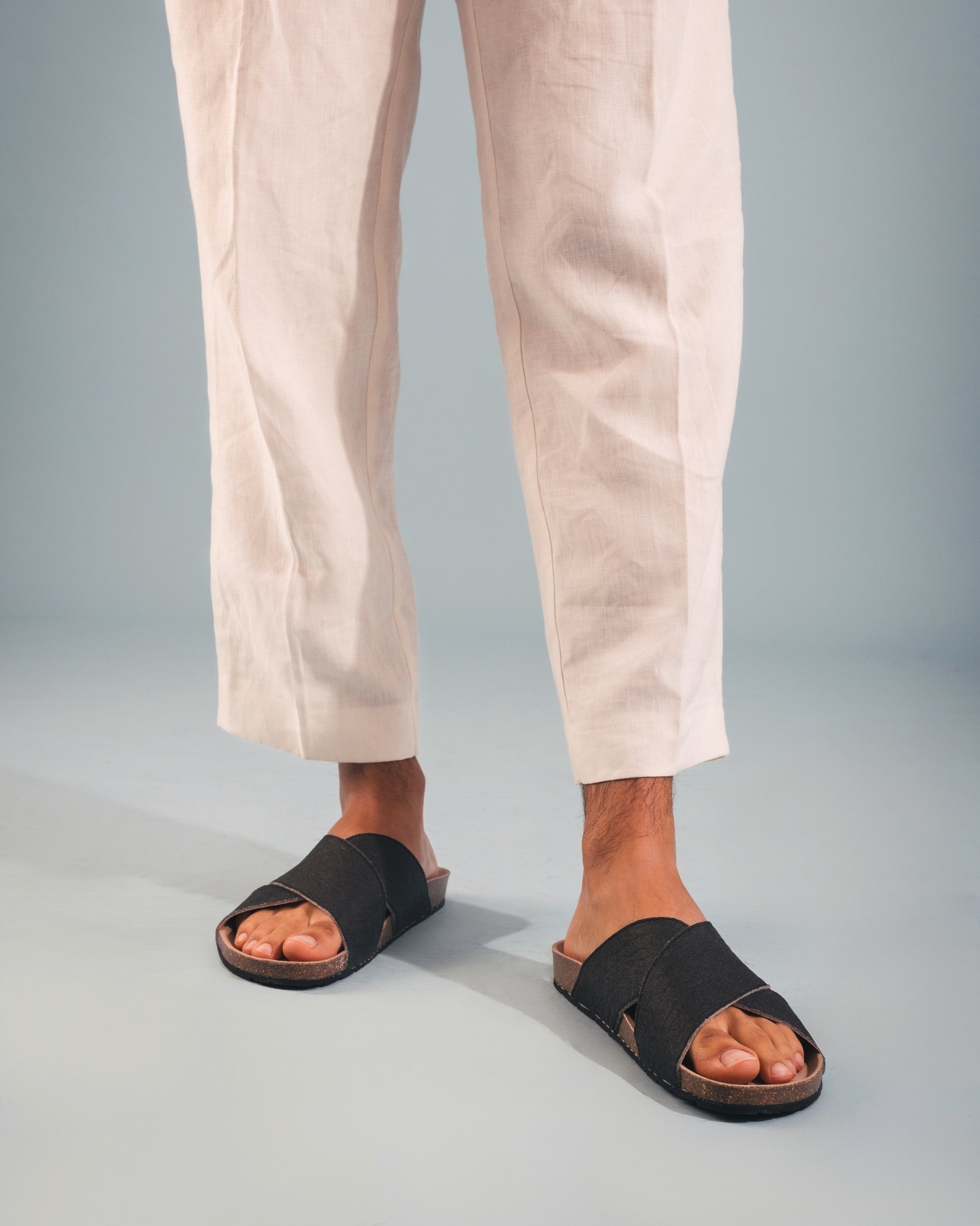 Sandale végane croisée audacieuse en Pinatex. Semelle intérieure liège, semelle pneus recyclés. Fabriquée au Portugal. 0,22 €/jour porté.
